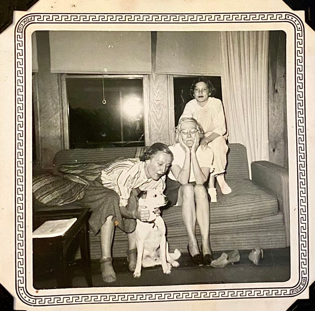 My grandmother, Bobbie, had two dogs during her adult life and their names were: Nip (Nippy, Nipsy, Nutsy) One, and Nip (Nippy, Nipsy, Nutsy) Two. Nip One is seen here above, being given much affection by the rolled-stocking-footed Bobbie, who is hanging out with her mom, Addie, and niece, Laurie, at Fort Henderson Farm one weekend long, long ago, most likely in the mid-1950s.